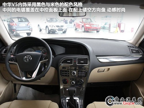 中華V5內(nèi)飾采用黑色與米色的配色風(fēng)格,中間的電鍍覆蓋在中控面板上面,在配以鏤空方向盤(pán)整體中控臺(tái)動(dòng)感時(shí)尚。