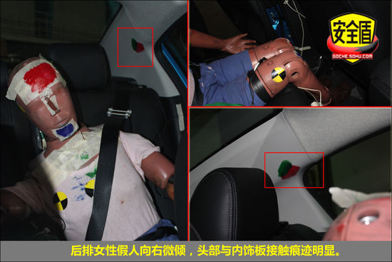 后排假人運(yùn)動(dòng)幅度較大,頭部與C柱內(nèi)飾板明顯接觸跡象,身體右傾,安全帶緊扣。