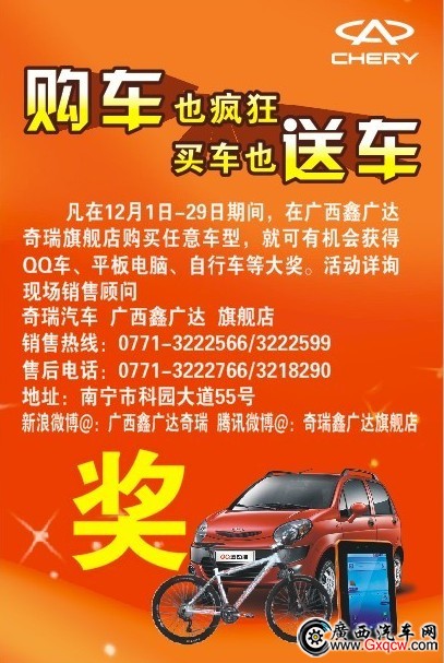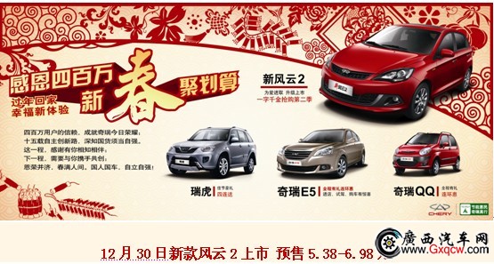 感恩四百萬 新春聚劃算 ——奇瑞汽車廣西鑫廣達(dá)旗艦店年末沖鉆抽QQ抽平板電腦以及新風(fēng)云2上市搶購倒計時 2012年12月29日,奇瑞汽車針對年末沖鉆將展開極限促銷活動,活動當(dāng)天現(xiàn)場的優(yōu)惠特價簡直超乎您的想象,您非來不可!不僅為您準(zhǔn)備了特價優(yōu)惠車,還為您準(zhǔn)備了豐富多彩的熱舞表演,精彩不容錯過!