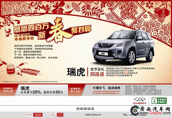 2012年不是終結(jié),2013新春即將到來!為慶祝奇瑞全球銷量突破400萬,12月1日起,奇瑞汽車再度傾情回饋!案卸魉陌偃f 新春聚劃算”大型優(yōu)惠全面啟動,瑞虎佳節(jié)豪禮四連送同步開展。節(jié)能禮、油卡禮、裝飾禮、金融/置換禮全新登場,新春購車瑞虎“有禮有面”。