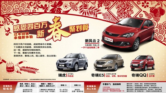 你還準(zhǔn)備擠在像沙丁魚罐頭一樣的車廂里回家過年嗎?你還準(zhǔn)備過年時(shí)提著大包小包走親訪友嗎?你還準(zhǔn)備在車站吹著西北風(fēng),瑟瑟發(fā)抖的等公交車嗎?奇瑞汽車“感恩四百萬,新春聚劃算”活動(dòng)幫助大家從此擺脫上述煩惱。還等什么!讓我們國(guó)人開國(guó)車,共同迎接新春佳節(jié)!