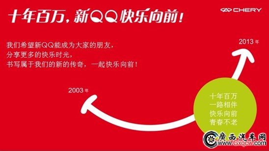 2002年,奇瑞汽車作為中國汽車行業(yè)崛起的新生力量,憑借年輕和敢于挑戰(zhàn)的精神,第一次把時尚引入小型汽車領(lǐng)域,并融合奇瑞QQ“快樂造車”理念,誕生出融時尚、快樂于一體的全新小車——奇瑞QQ,并誕生了中國第一條小車時尚大片,告訴消費(fèi)者時尚如平時穿衣一樣,輕松可得,快樂可以很簡單,開上QQ就行。第一次讓購車有了時尚的選擇,在商務(wù)車、家庭車、豪華車、經(jīng)濟(jì)車、小車中開創(chuàng)出屬于自己的一片獨(dú)特領(lǐng)域?梢院敛豢鋸埖恼f,奇瑞QQ帶動整個中國小車時尚化風(fēng)潮,給出了小車時尚發(fā)展的指引,締造了一個只屬于奇瑞QQ的時尚快樂傳奇。