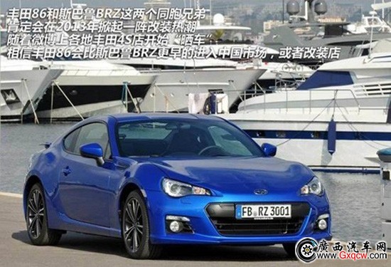 豐田86和斯巴魯BRZ這兩個(gè)同胞兄弟肯定會(huì)在2013年掀起一陣改裝熱潮,隨著微博上各地豐田4S店開始“曬車”,相信豐田86會(huì)比斯巴魯BRZ更早的進(jìn)入中國(guó)市場(chǎng),或者改裝店。當(dāng)斯巴魯BRZ隨后拍馬趕到時(shí),這倆車誰的操控更好那么一點(diǎn)點(diǎn),誰的極限更高那么一點(diǎn)點(diǎn),都會(huì)是各位車迷、媒體人所津津樂道的事情。