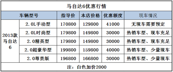 8月一直被各方看好的2013款Mazda6在廣西鑫廣達(dá)正式問世,短短數(shù)日,2013款馬自達(dá)6已吸引了廣西各地消費(fèi)者關(guān)注的目光。新款車型在保留原款車型亮點(diǎn)基礎(chǔ)上,外觀、內(nèi)飾、配置等全面升級,將“駕駛樂趣”的價值進(jìn)行了最大程度發(fā)揮, 12.98萬元起售的終端價格,橫掃A級、B級兩大市場。現(xiàn)在購車可享超值免息貸款購車特殊金融方案,20%的超低首付,24期超長免息貸款。不到5萬,您就可以把一輛全新的超具性價比的中級轎車馬自達(dá)6開回家。近期有購車意向的消費(fèi)者不妨耐心了解下,想想以A級車的價格享受B級車的待遇,何樂而不為呢? 心動熱線:18077789848(網(wǎng)絡(luò)購車更優(yōu)惠,撥通電話即送價值98元的原廠多送能電子胎壓儀)