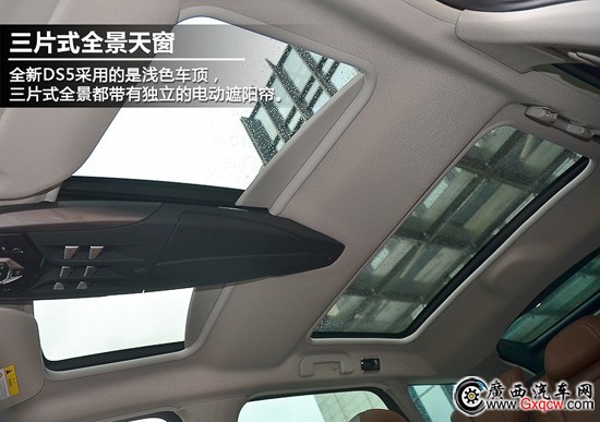 國產(chǎn)DS5延續(xù)了進口版的三片式全景天窗的設(shè)計,每一片玻璃都帶有獨立的電動遮陽簾但不可開啟,另外新車后排頭頂新增加了一個后排遮陽簾開關(guān)。