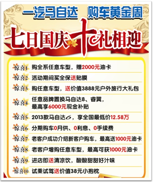 國慶黃金周,購車正當(dāng)時(shí)!廣西鑫廣達(dá)一汽馬自達(dá)喜迎國慶,以最瘋狂的價(jià)格,最誘人的購車金融方案,最超凡的試乘試駕體驗(yàn)、最貼心的購車服務(wù)為您奉上十月最強(qiáng)十重豪禮!