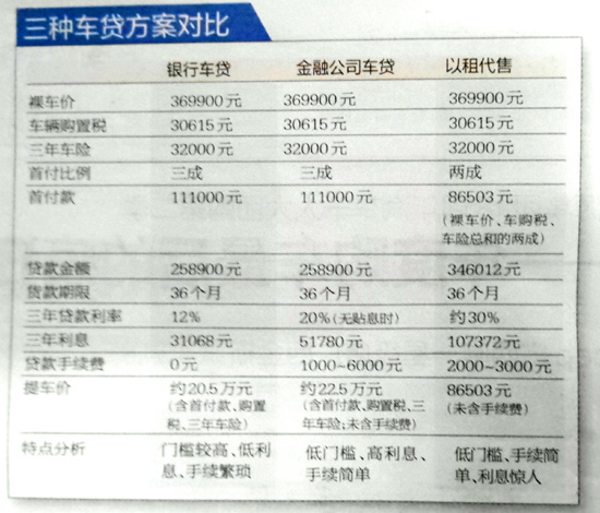 同樣以售價36.99萬元的車輛為例,如果按照金融公司三年20%的貸款利率計算,貸款七成的貸款金額為25.89萬元,利息為5.18萬元,約比銀行高出兩萬元。這種方式的提車價為首付款、購置稅、三年車險、利息總和,合計約22.5萬元。車友還需繳納1000至6000元不等的貸款服務(wù)費(fèi)。
