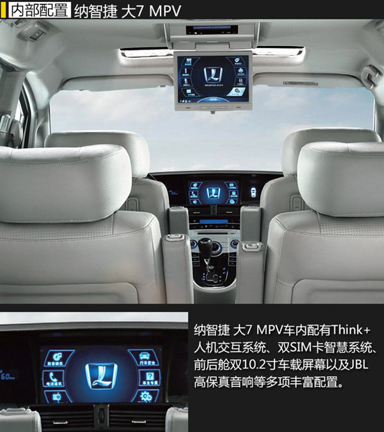 作為一款高端MPV車型,納智捷 大7 MPV擁有超越一般車型的豪華的內飾風格,車內座椅均采用真皮材質,駕駛座附帶8向電動調節(jié)功能,同時帶有記憶、電動腰靠及按摩功能,第一、二排均配有同級車獨有的“蝴蝶式包覆頭枕”,駕乘舒適性得到有效提升。此外,7支高保真 JBL揚聲器配合10.2寸超大液晶屏幕,也使駕乘者能夠在旅途中隨時享受強大的視聽饗宴。納智捷大7 MPV配備了THINK+系統(tǒng),內設影音娛樂、電話通訊、衛(wèi)星導航、行車安全、車主專屬、系統(tǒng)設定6大功能。其中影音娛樂功能可以提供廣播、光盤播放、USB存取、AUX/AV IN等外接影音功能;電話通訊功能提供無線藍牙、短信閱讀、電話簿設定等通訊服務,同時可以利用智能學習聲控系統(tǒng)進行操作,提升了行車過程中的安全性;衛(wèi)星導航功能搭載了NAVI系統(tǒng),可通過語音導航系統(tǒng)提供旅游地點引導、天氣及停車資訊服務。