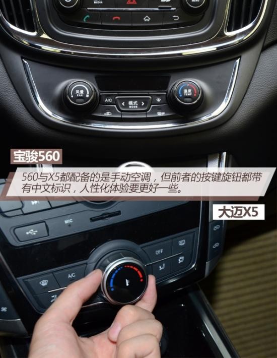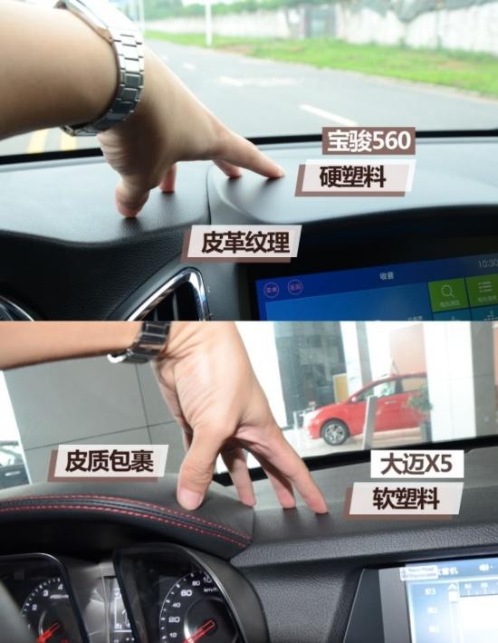 560的中控臺大面積采用硬塑料,不過皮革紋理的處理還是有著不錯效果的,并不缺乏檔次感,而X5的中控大面積采用軟塑料,儀表盤上方還采用了皮質(zhì)包裹,檔次感要優(yōu)于560。