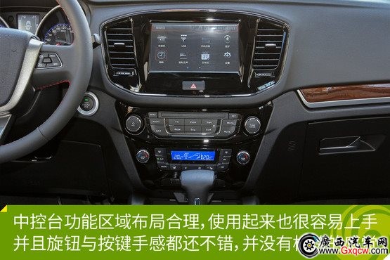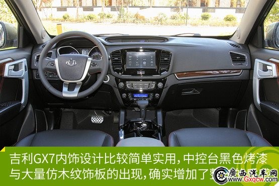 坐進(jìn)吉利GX7車內(nèi),內(nèi)飾的設(shè)計感覺比較簡單實(shí)用,大塊面板均使用了搪塑材質(zhì),同時還在中間使用了仿桃木的飾板渲染了一定的豪華質(zhì)感。中央彩色大屏為電阻式觸摸屏,并采用了啞光的處理。這套系統(tǒng)支持我們平時能夠用到的大部分功能。