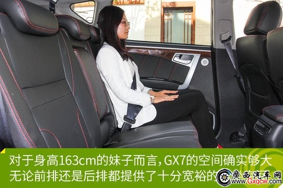 在空間體驗(yàn)方面,體驗(yàn)者身材比較嬌小,對于這個身高163cm的妹子而言,GX7的空間確實(shí)十分大,無論是前排還是后排都提供了十分寬裕的空間,不過對于身高180cm的男士來說,GX7的空間也不會有任何局促。