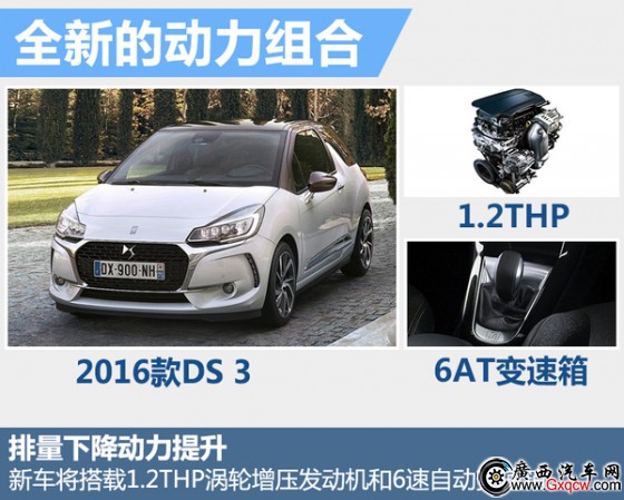DS 3是DS品牌旗下一款采用3門5座設(shè)計的兩廂車,定位于豪華小型車市場,中國市場目前銷售的現(xiàn)款DS 3使用的是1.6L自然吸氣發(fā)動機(jī)。不久前,新款DS 3在巴黎正式亮相。新車預(yù)計將于2016年內(nèi)正式上市,并有望以進(jìn)口的方式進(jìn)入國內(nèi)市場。近日,網(wǎng)通社從DS官方獲悉,動力方面,新款DS 3采用了PSA集團(tuán)最新研發(fā)的1.2THP小排量渦輪增壓發(fā)動機(jī)。由于排量的降低,新車進(jìn)入中國市場后消費稅率將小幅下調(diào),進(jìn)而整車價格較現(xiàn)款車型也將有所下降。