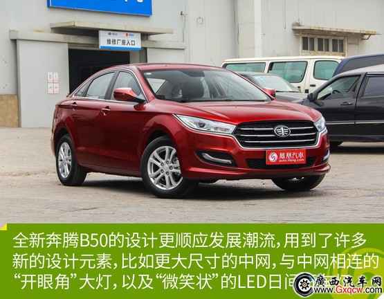 造型方面,全新奔騰B50采用最新家族式前臉,前進氣格柵在保留經(jīng)典三橫幅樣式的基礎上,尺寸進一步加大,前大燈造 型則更加犀利,前保險杠兩側(cè)格柵內(nèi)配有LED日間行車燈。側(cè)面的腰線從中間至兩邊采用了漸變的設計,前后凌厲,中間 比較舒緩,配合下部微微上揚的棱線,整體看上去比較動感。此外,新車運動版車型在前翼子板處嵌有“TURBO”的標識 ,同時尾部配備有后擾流板。