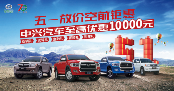 此次中興汽車“五一”鉅惠可謂力度空前,燃情十足,五重大禮各個有料,款款精彩。其中促銷大禮更是紅運來襲,旗下全系產(chǎn)品最高優(yōu)惠高達10000元,部分車型還有3000元老用戶置換及1500元金融貼息大禮相伴,諸如威虎越野版柴油2.5T車型綜合最高鉅惠將達到13000元。同時,領(lǐng)主乘用、商用版,小老虎經(jīng)典版等車型也將享受到不同程度優(yōu)惠。