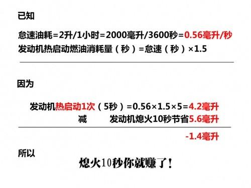 發(fā)動(dòng)機(jī)熱啟動(dòng)的燃油消耗量是正常怠速消耗量的1.5倍,發(fā)動(dòng)機(jī)冷啟動(dòng)比熱啟動(dòng)的消耗量要再高出0.5倍。以此得出理論數(shù)據(jù)為:怠速油耗2升/小時(shí),折算下來(lái)怠速10秒鐘消耗5.5毫升,啟動(dòng)一次(5秒)的油耗為4.125毫升,也就是說(shuō)哪怕之熄火10秒鐘你就賺了。按一個(gè)紅綠燈平均等候60秒算,刨去啟動(dòng)的燃油消耗,12個(gè)紅燈就能節(jié)省一聽(tīng)可樂(lè)(355ml)的燃油。