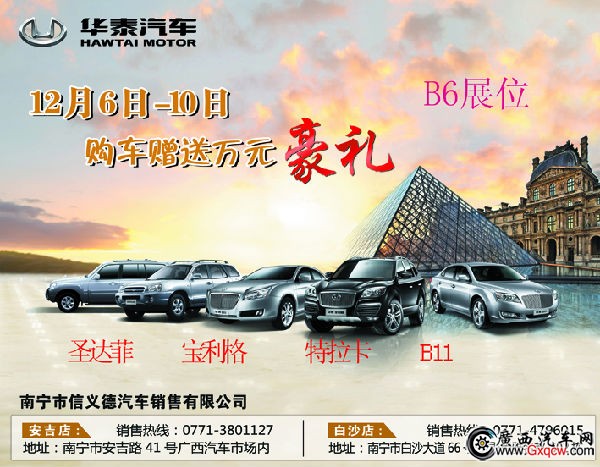 為喜迎第五屆中國(guó)-東盟(南寧)國(guó)際汽車(chē)展覽會(huì)12月6日-10日隆重舉行,華泰汽車(chē)真情回饋廣大客戶,車(chē)展期間購(gòu)車(chē)可享受萬(wàn)元豪禮優(yōu)惠,每日將推出兩臺(tái)寶利格特價(jià)車(chē),蒞臨B6展位賞車(chē)購(gòu)車(chē)顧客朋友即可獲贈(zèng)精美禮品一份!垂詢熱線:0771-3801127 地址:南寧市安吉路41號(hào)廣西汽車(chē)市場(chǎng)內(nèi)