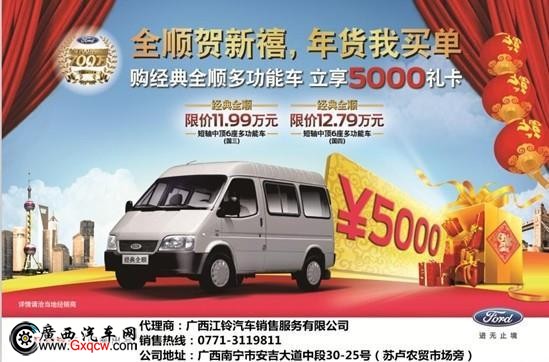 新春佳節(jié),江鈴福特全順祝您一路全順,馬上有禮!江鈴福特經(jīng)典全順新春促銷進入倒計時,即日起前往廣西江鈴全順4s店,凡購買江鈴福特經(jīng)典全順多功能車,就可獲贈5000元購物禮卡。更有全順明星車型短軸中頂6座多功能車(國四)限價12.79萬元起,多項優(yōu)惠等您來贏取。