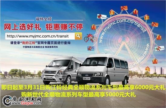 近日,編輯從廣西江鈴汽車銷售服務有限公司了解到,3月1日至3月31日推出的定購江鈴經(jīng)典全順物流系列車型立享6000元讓利:4000元現(xiàn)金+2000元維修保養(yǎng);定購新世代全順物流系列車型*高享5000元大禮。