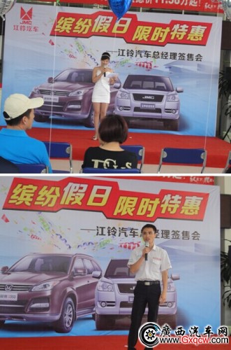 接下來,江鈴汽車簽單會正式開幕,靚麗大方的主持人隨著歡快音樂走上舞臺并有請江鈴JMC品牌經(jīng)理吳經(jīng)理致辭,預(yù)祝簽單會圓滿成功。