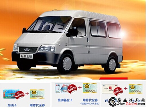 二、訂購江鈴經(jīng)典全順即可享受價值4000元油卡/價值4000元一號店購物卡/價值5200元旅游基金再加6000元維修代金券;