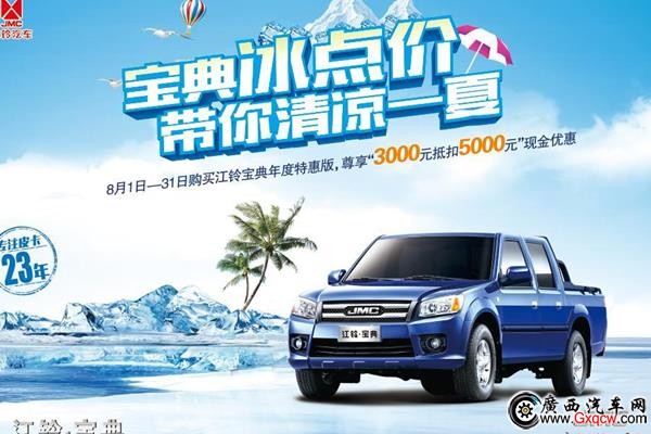 8月1日至31日購(gòu)買江鈴寶典尊享“3000元抵扣5000元”現(xiàn)金優(yōu)惠,詳情請(qǐng)咨詢,廣西江鈴安吉4S店。咨詢熱線:0771-3119811.地址:南寧市安吉大道中段30-25號(hào)