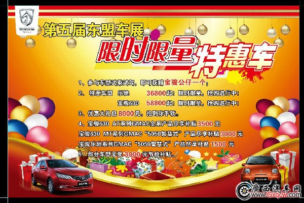 寶駿汽車旗艦店廣西駿鑫汽車銷售服務(wù)有限公司推出本年度*大優(yōu)惠促銷,讓利空間超出你的想象。我們的展位在9號(hào)館6號(hào)位。特惠車限時(shí)限量,一定要抓緊時(shí)間,時(shí)間有限,車輛有限。