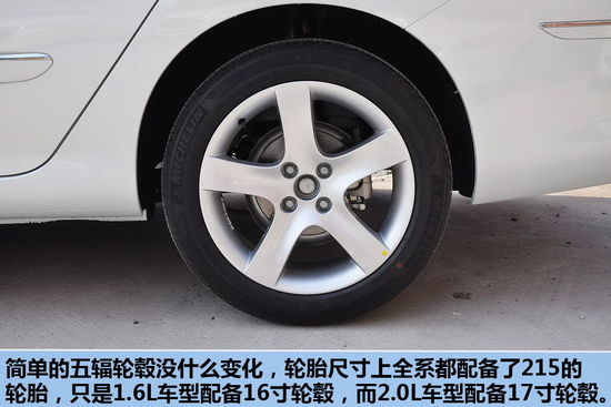 簡單的五輻輪轂沒什么變化,輪胎尺寸上全系都配備了215的輪胎,只是1.6L車型配備16寸輪轂,而2.0L車型配備17寸輪轂。