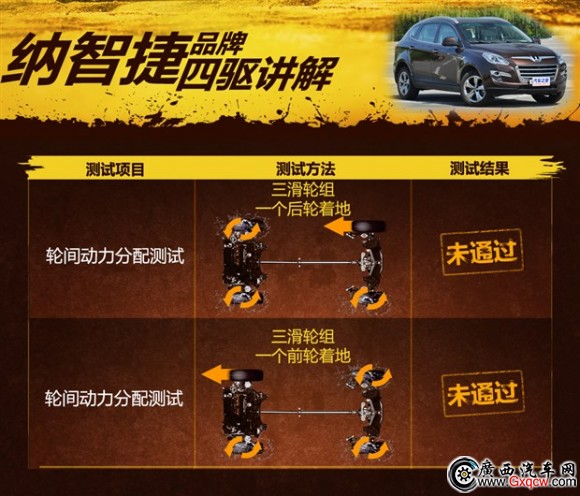 單獨(dú)車輪著地是難度*高的測試項(xiàng)目,交叉軸都無法通過的大7在此項(xiàng)目中同樣無能為力,打滑車輪瘋狂旋轉(zhuǎn),沒有任何制動效果,結(jié)果自然是失敗。