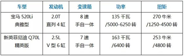 我們拿寶馬5系和新英菲尼迪Q70L的入門(mén)車(chē)型進(jìn)行對(duì)比,先看數(shù)據(jù):