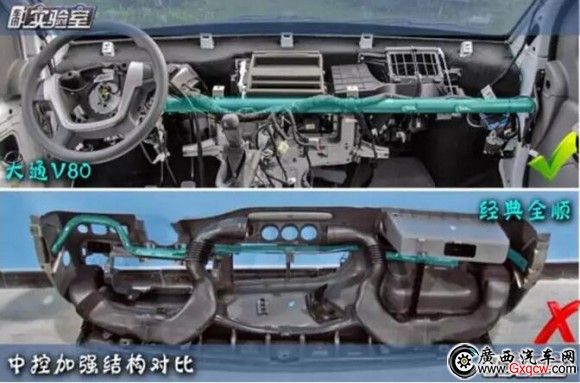 中控支撐桿就是藍(lán)色標(biāo)注部位,該零件主要承擔(dān)支撐中控部件的作用,換句話說,大部分零件固定依靠它為中心點(diǎn),好比大樹的主干。同時(shí)它也能起到車身側(cè)向加強(qiáng)與正面防護(hù)的作用。原則來說,大通V80和經(jīng)典全順的支撐桿連接方式都是沒有問題的,但從強(qiáng)度以及整體布局來看,大通V80設(shè)計(jì)更為合理。
