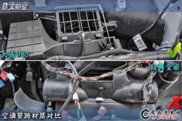 經(jīng)典全順非金屬內(nèi)飾結(jié)構(gòu)以及空調(diào)管路壁厚比較薄,而且兩個(gè)空調(diào)管連接處密封性較差,沒有卡扣設(shè)計(jì)容易脫落。兩車在非金屬材料的選用上完全沒有可比性。