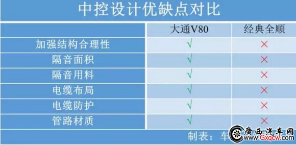 經(jīng)典全順中控隔音分為上下兩部分,上半部分采用海綿塑形,下半部分采用膠質(zhì)層與海綿層作為隔音材料,隔音棉覆蓋面約占中控總面積的95%。從隔音材質(zhì)的品質(zhì)方面以及隔音覆蓋面方面,大通V80優(yōu)于經(jīng)典全順。
