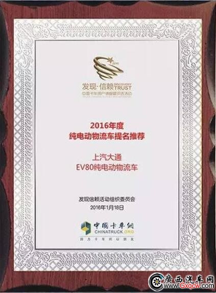 上汽大通EV80純電動物流車通過發(fā)現(xiàn)信賴組委會審核獲 “2016年度純電動物流提名推薦”。